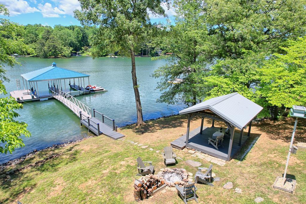 AMAZING NEW PRICE for DEEP WATER with ownership to the 1928, a large inviting interior and outdoor social spaces galore make this THE ONE! These sellers have been excellent stewards of this property and completed a full exterior paint job, new garage door and NEW ROOF in 2022, a water purification filter system* in 2024 and with FIBER OPTIC already there? Your only job is R & R on Lake Chatuge! The sweet living area with deep masonry fireplace for roaring fall and winter fires, large dining area and granite kitchen, plus bonus den/office all offer BIG VIEWS of the lake, year round! The rooms are large so loads of space for last minute guests at mealtime and maybe a game table for those rainy days and wait till you see the primary bath! Nice screened porch and open sun deck off the main level with covered patio space below, firepit and small lakeside pavilion are all just steps from your double covered dock with large swim platform and jet ski ramps! The terrace level has a large game area that can multi-function as additional sleep space, large enough for a bunkroom, has a full bath and a 2nd FULL KITCHEN! SO much opportunity for terrace level rentals, a guest or family suite or rent the whole house for passive income as the home has solid rental history! Lots of lake toys? LOTS of room in either the lakefront shed OR the unfinished workshop on the far side of the walk-out basement! This gentle laying lot is prime for a large garden or summer games and is located in a mature neighborhood in a much sought after cove! Just a quick drive to town but far enough to see the stars! Comfy lakefront living, just ready and waiting! * Top of the line $7K water purification system with double tank